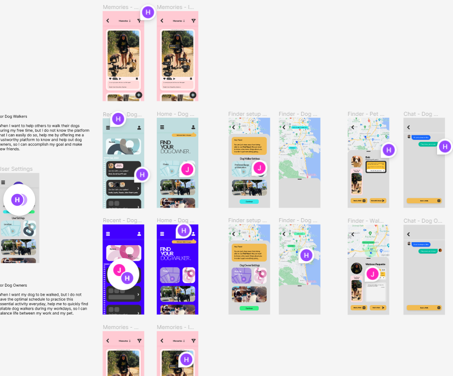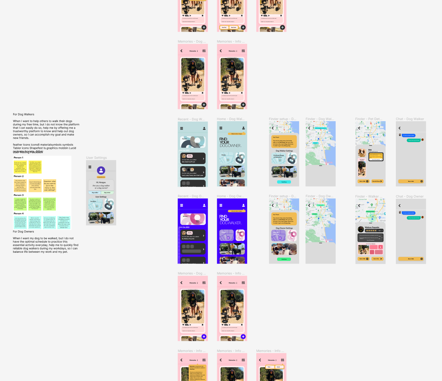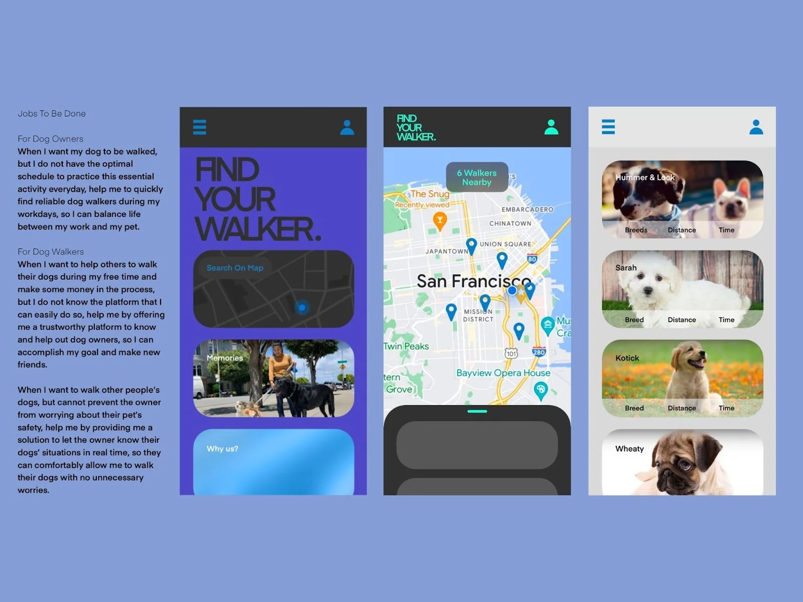 The research phase of this project utilizes the findings gathered from user interviews to form user archetypes and user journey maps separately for the two different parties the app is designed for. They highlight the pain points of the users’ experiences in terms of dog walking and sets up for the solution.
