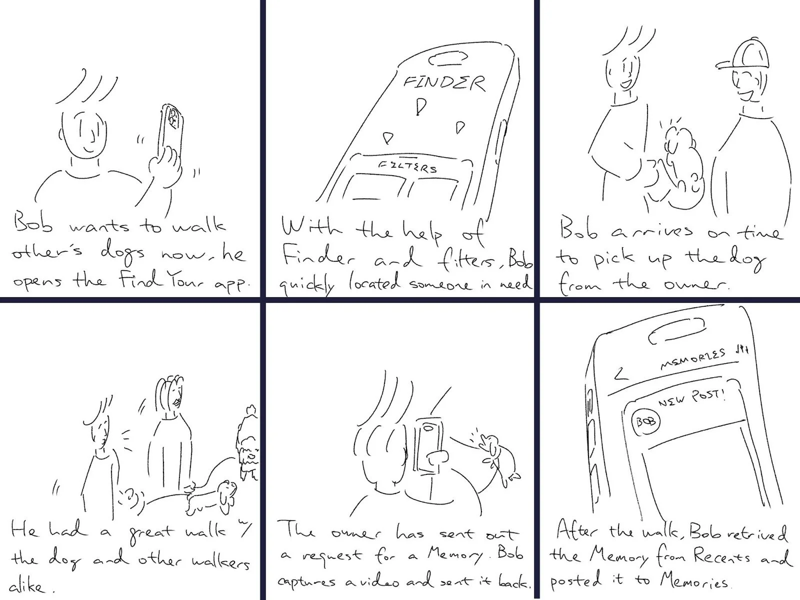 The crucial feature that makes the Find Your. social ecosystem is the ability to re-access past Memory Requests from the Recent tab. By visiting there, both the walker and the owner would be able to edit and post to Memories from those Memory Requests. Posting in Memories becomes a simple, encouraging and mutually beneficial experience.